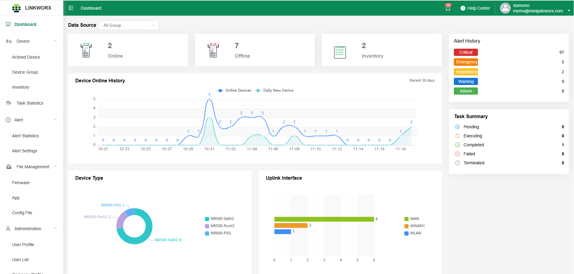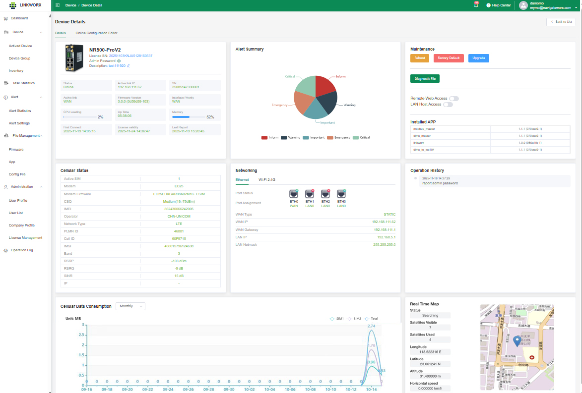 The Navigateworx Self-Developed Device Management Platform enables centralized and unified management of devices and data. Its functions include monitoring running status, configuring parameters, performing mass firmware upgrades, and managing users.